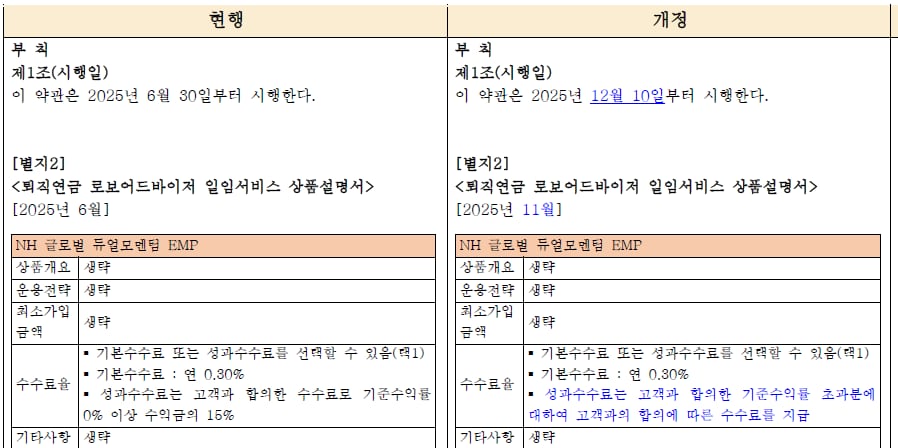 이달 10일 시행된 NH투자증권 퇴직연금 로보어드바이저 약관 개정 내용. /NH투자증권 제공 |