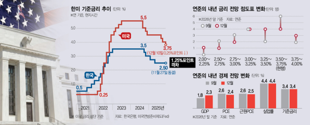 연준은 10일(현지 시간) 연방공개시장위원회(FOMC) 정례회의를 통해 0.25%포인트 금리 인하를 결정하면서 내년 미국의 경제성장률은 2.3%로 높여 잡았다. 불과 3개월 전인 9월 전망치(1.8%)보다 0.5%포인트나 상향 조정한 셈이다. 시장에서는 연준이 내년 말 기준금리 예상치를 현 수준(3.5~3.75%)보다 살짝 낮은 3.4%로 제시한 배경에도 미국 경제에 대한 낙관론이 자리했다고 해석했다. 미국의 경제 규모를 감안할 때 이 같은 성장률 전망은 한국 등 다른 나라를 압도하는 수준이다. 앞서 한국은행은 지난달 우리나라의 경제성장률이 올해 1.0%, 내년 1.8%에 그칠 것으로 전망했다. 이와 관련해서는 스콧 베선트 미국 재무장관도 최근 CBS방송에 출연해 “올해 실질 GDP 성장률이 3%로 마무리될 것”이라고 자신했다.