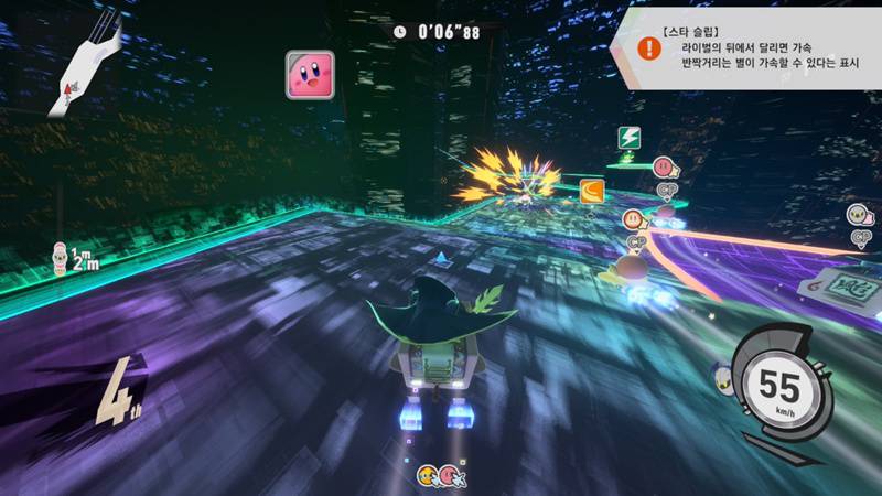또 레이싱이 기본인 에어 라이드 모드에서는 B 버튼을 연타하면 제자리에서 점프하는 듯한 호핑을 활용해 커브를 빠져나가는 방식의 운영도 즐길 수 있다. 여기에 기본적으로 적을 흡수해 능력을 카피하는 커비의 특성도 살렸다.