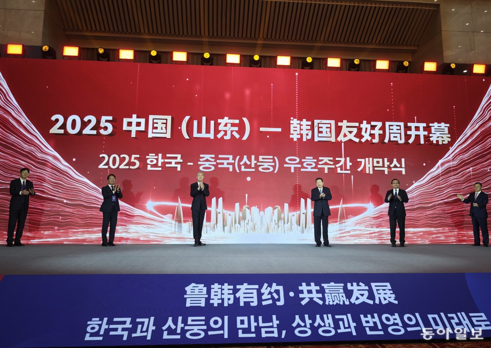 2025년11월 20일 산둥성 지난시에서 열린 ‘한중 우호주간’ 행사에서 노재헌 주중대사(왼쪽 세번째)와 저우나이샹 산둥성 성장(오른쪽 세번째)이 개막선언을 하고 있다. 지난=김철중 특파원 tnf@donga.com |