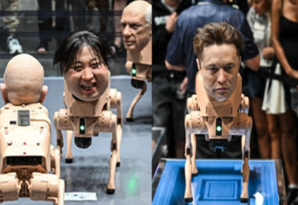 전시에 나온 로봇에는 일론 머스크 테슬라 CEO, 제프 베이조스 아마존 창업자, 마크 저커버그 메타 CEO 등 테크 재벌은 물론 앤디 워홀과 파블로 피카소 등 미술사 거장들의 얼굴이 사용됐다. 또 김정은과 작가 본인의 얼굴을 본뜬 로봇개도 등장했다.