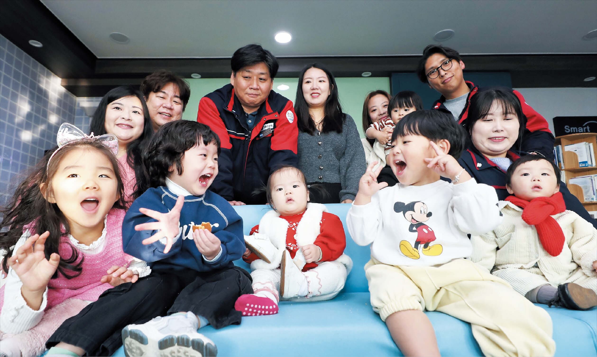김동환 기자10일 부산 사하구 SB선보 다대1공장 스마트라운지(휴게실)에서 SB선보 직원과 그 아이들이 환하게 웃고 있다. SB선보는 2008년 중소기업으론 최초로 성평등가족부(당시 여성가족부) ‘가족 친화 기업’ 인증을 받았다. |