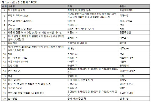 연말을 맞아 경제경영서의 강세도 두드러졌다. ‘트렌드 코리아 2026’(2위)을 비롯해 10만 부 돌파 기념 특별판 ‘박곰희 연금 부자 수업 (10만 부 기념 스페셜 에디션)’(6위), 투자 신간 ‘인사이더 인사이트’(11위) 등이 주목받았다. 특히 ‘인사이더 인사이트’는 재테크 관심이 높은 3040 남성 독자층(57.3%)의 강한 지지를 얻은 것으로 나타났다.