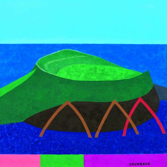 유영국의 'Work'는 작가 후기 미학을 응축해 보여주는 대표작으로, 하늘과 바다의 수평선 구조 위에 단순화된 타원형 분화구와 완만한 능선의 거대한 산이 하나의 색면처럼 자리해 화면 중심을 이룬다. 산 아래 반복되는 아치형 구조와 하단 색면은 풍경에 구조적 리듬과 장식성을 더한다. 추정가는 7억~12억원이다.