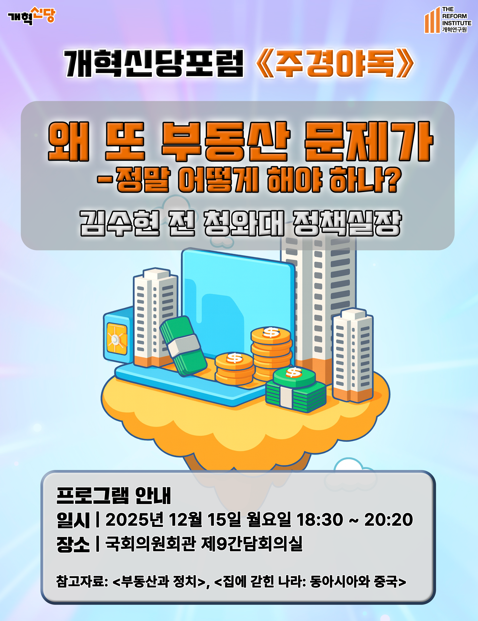 개혁신당포럼 ‘주경야독’은 15일 ‘부동산 정책, 왜 실패했고 무엇을 바꿔야 하는가’를 주제로 포럼을 열 예정이라고 12일 밝혔다. 한국 부동산 정책이 왜 반복적으로 실패해 왔는지와 그 실패의 경험을 바탕으로 어떤 변화의 계기로 삼을 것인지가 논점이다. 구체적으로 △한국 부동산 정책 실패의 구조적 원인 △수요·공급·금융 정책 간 설계 미스매치 △현 정부 규제 방향의 적정성 △청년·서민의 주거 사다리를 다시 세우기 위한 정책 원칙 등을 다룰 예정이다.