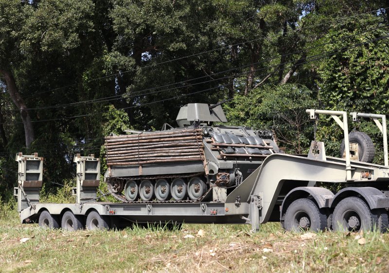 태국 수린주 캅초엥에서 12일(현지시간) 태국군이 장갑차를 수송하고 있다. EPA 연합 |