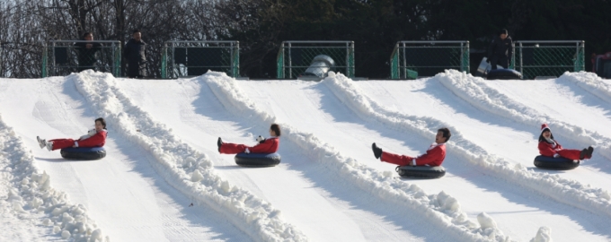 12일 경기 용인 에버랜드 눈썰매장 '스노우 버스터'에서 산타 복장을 한 직원들이 눈썰매를 타고 있다. /사진=뉴스1 |