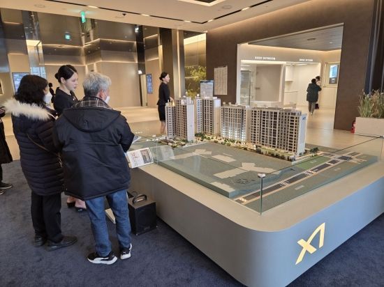 서울 강남구 대치동 '역삼센트럴자이' 견본주택에 설치된 모형도를 방문객들이 살펴보고 있다. 이정윤 기자 |
