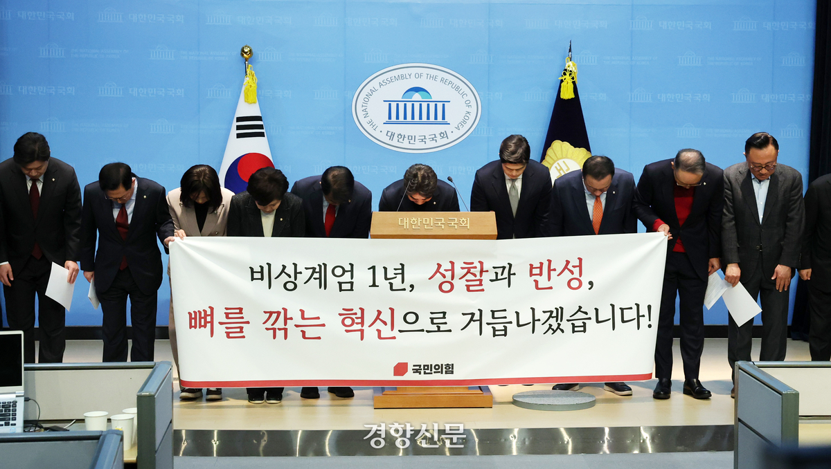 국민의힘 초·재선 의원들이 지난 12월 3일 국회 소통관에서 12·3 불법 계엄 사과 기자회견을 하며 고개 숙여 인사하고 있다. 박민규 선임기자 |