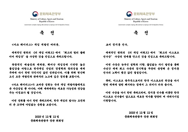 최 장관은 '아크 레이더스' 개발진에게 "이번 수상은 독창적인 예술성과 세계관, 뛰어난 게임성에 기반한 높은 몰입감을 바탕으로 한국 게임산업의 경쟁력과 창의성을 세계 무대에 다시 한번 각인시킨 값진 성과다"라고 격려했다. 쵸비 정지훈 선수에게는 "이번 수상은 눈부신 실력과 기량, 끊임없는 자기 발전을 통해 수년간 세계 최고 수준의 경기력을 꾸준히 증명해 온 정지훈 선수의 노력이 맺은 값진 결실"이라며, "이스포츠 종주국으로서의 한국 이스포츠의 위상을 다시 한번 세계에 알린 쾌거"라고 축하했다.
