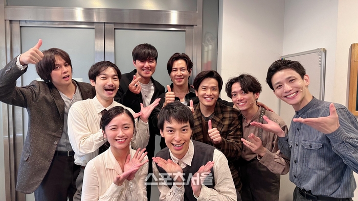 뮤지컬 ‘팬레터’의 주역 김종구와 이규형(이상 가운데)이 지난해 9월 일본 라이선수 초연 배우 ‘김해진’ 역(왼쪽), ‘히카루’ 역과 ‘정세훈’ 역(이상 앞 왼쪽부터) 등을 응원하기 위해 현지 공연장을 방문했다. 사진 | 표권향 기자 gioia@sportsseoul.com |
