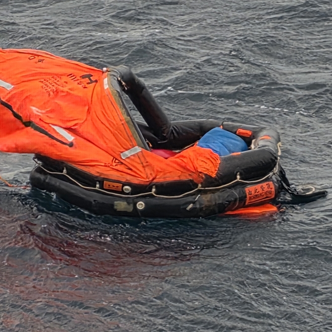 지난 12일 서귀포항 남쪽 33㎞ 해상에서 중국인 선원 5명이 바지선이 침수되기 시작하자 구명뗏목을 타고 탈출했다. 제주지방해양경찰청 제공 |