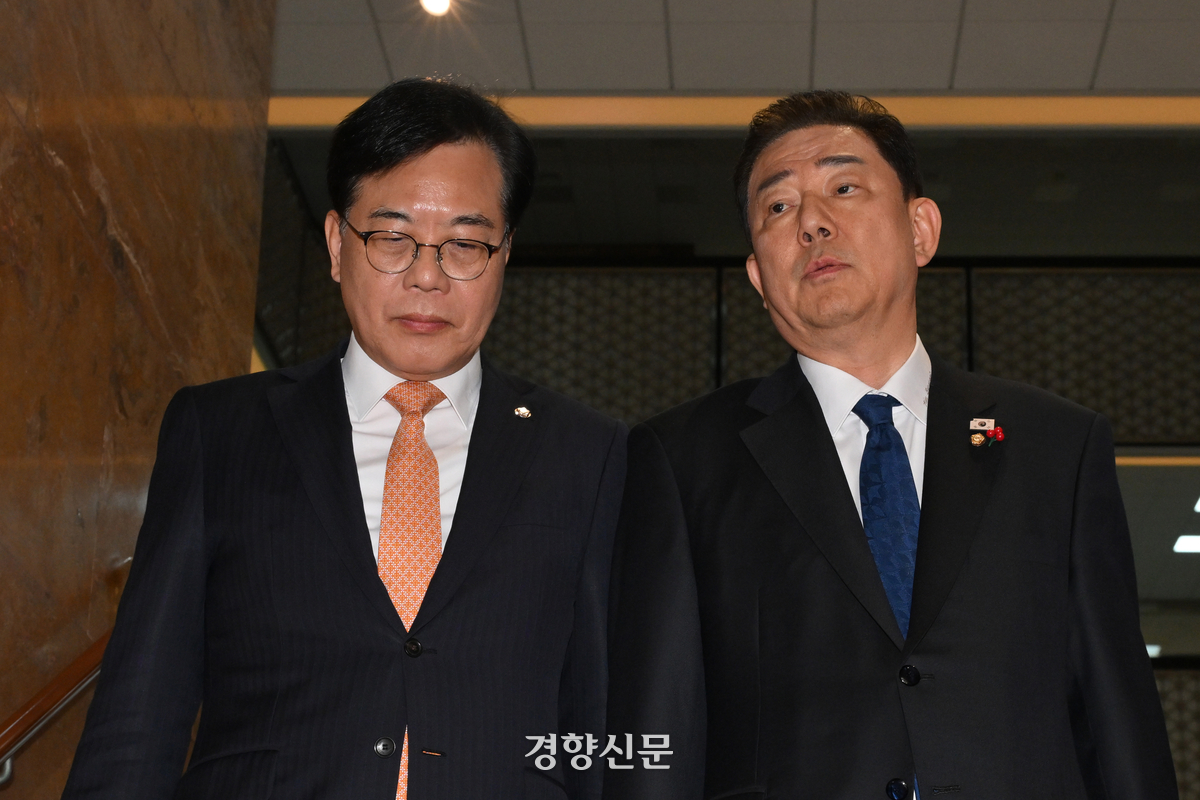 송언석 국민의힘 원내대표(왼쪽)와 김병기 더불어민주당 원내대표가 지난 9일 국회에서 우원식 국회의장 주재 하의 회동을 마치고 대화하고 있다. 권도현 기자 |