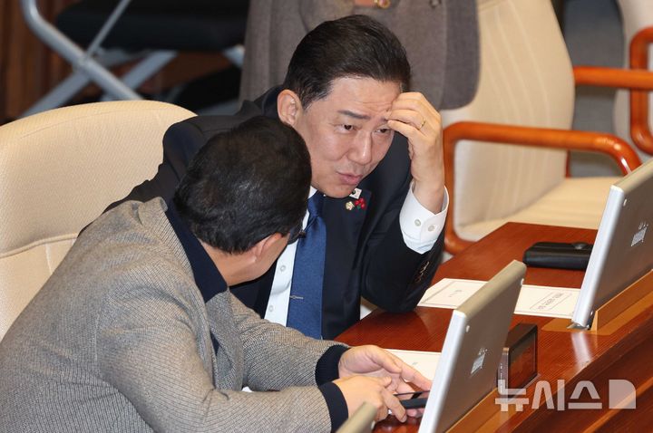 [서울=뉴시스] 조성봉 기자 = 김병기 더불어민주당 원내대표가 13일 오후 서울 여의도 국회에서 열린 본회의에서 박홍근 의원과 대화를 하고 있다. 2025.12.13. suncho21@newsis.com