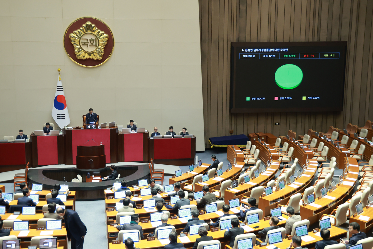 지난 13일 국회에서 열린 12월 임시국회 본회의에서 은행법 일부개정법률안에 대한 수정안이 가결되고 있다. 연합뉴스 |