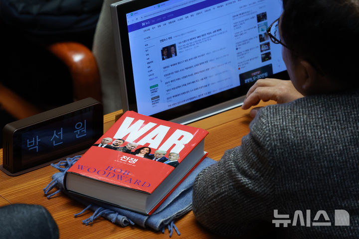 [서울=뉴시스] 고승민 기자 = 14일 서울 여의도 국회에서 열린 본회의에서 박선원 더불어민주당이 뉴스를 보고 있다. 책상에 '전쟁'이라는 제목의 도서가 놓여 있다. 2025.12.14. kkssmm99@newsis.com