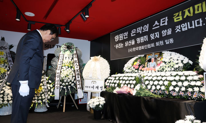 [서울=뉴시스] 홍효식 기자 = 최휘영 문화체육관광부 장관이 14일 고(故) 김지미 배우의 추모 공간이 마련된 서울 충무로 서울영화센터를 찾아 금관문화훈장을 추서하기 앞서 조문을 하고 있다. (사진=문화체육관광부 제공) 2025.12.14. photo@newsis.com *재판매 및 DB 금지