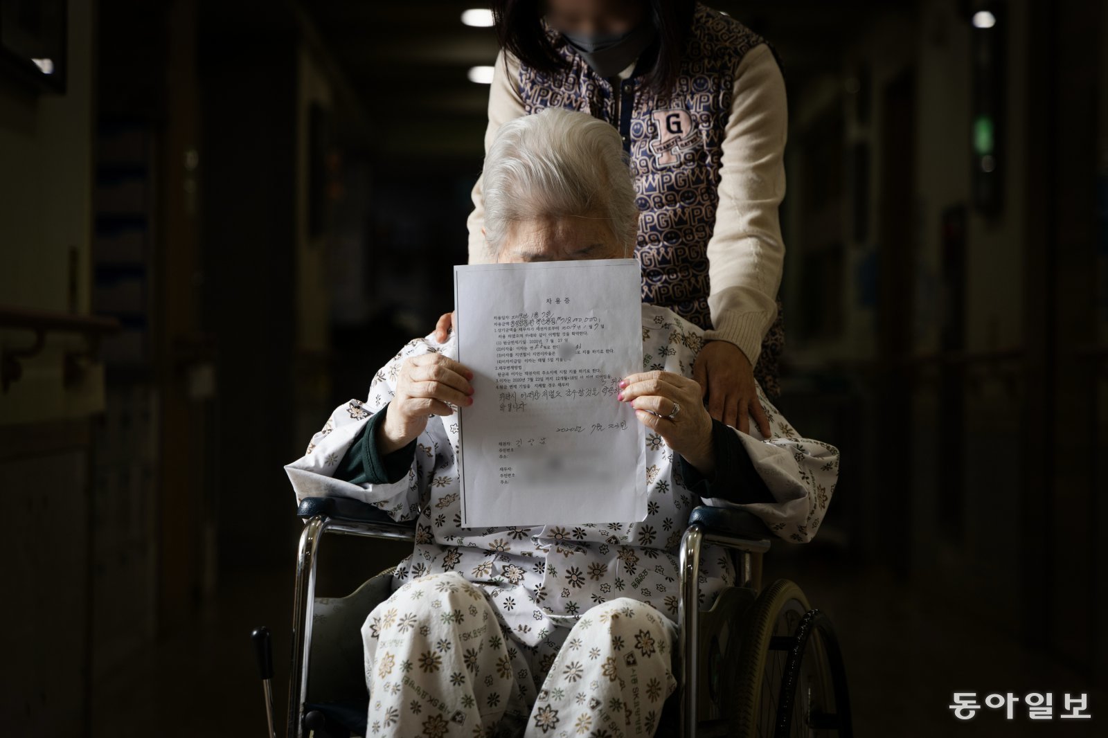 지난달 17일 경기 시흥시의 한 요양병원 복도. 서향분 씨가 친척이 끌어주는 휠체어에 앉아 ‘원금 변제기일을 지체할 경우 처벌을 감수하겠다’고 적힌 빛바랜 차용증을 들어 보이고 있다. 그는 2016년부터 ‘딸 같은 이웃’에게 6억 원이 넘는 돈을 빌려준 뒤 돌려받지 못했다. 평생을 바쳐 마련한 상가는 경매로 넘어갔고, 남편은 병세가 나빠져 세상을 떠났다. |