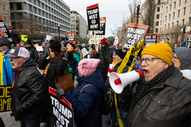 미국 시민들이 13일(현지시간) 워싱턴 D.C.의 라파예트 공원 인근에서 '백악관 포위 2.0' 시위를 벌이고 있다. 주최 측은 '백악관 포위 2.0'이 '트럼프는 당장 물러나라! 백악관은 범죄 현장이다!'라는 국민의 기소장을 전달하기 위한 비폭력 시위라고 규정했다./EPA·연합 |