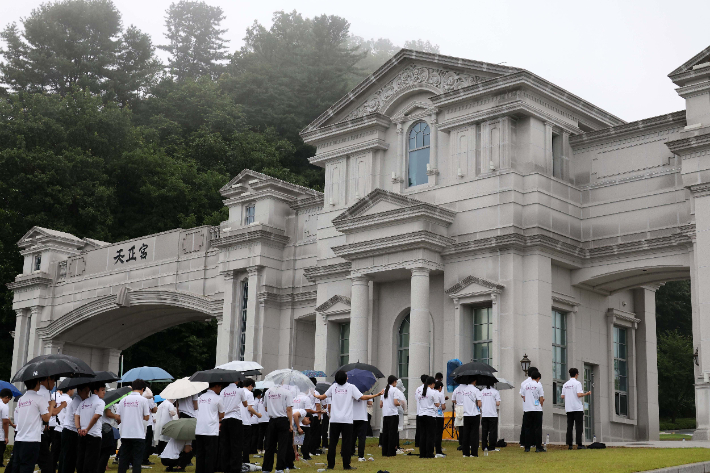 가평 통일교 천정궁 앞에 모인 신도들의 모습. 박종민 기자 |