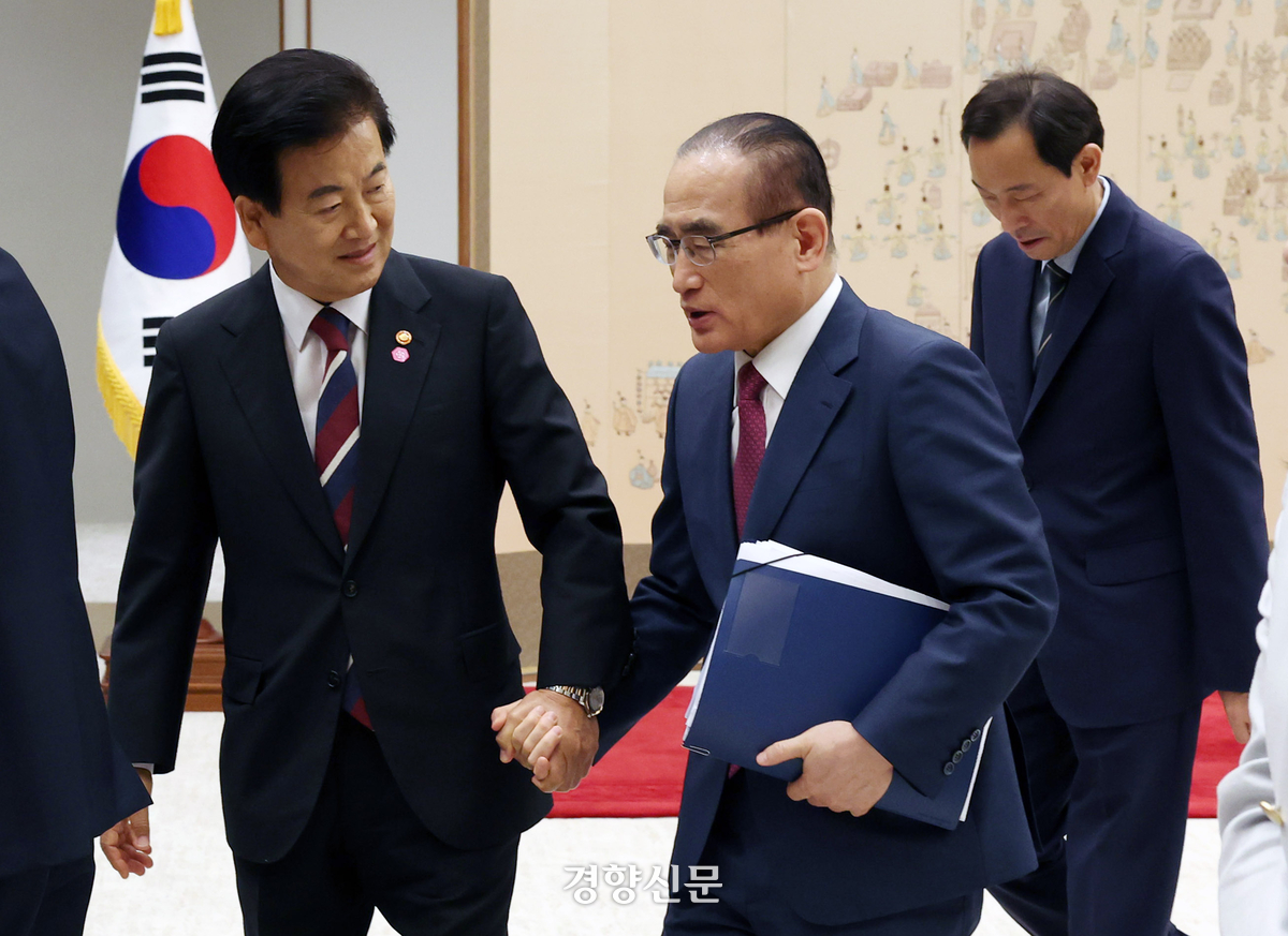 지난 7월 28일 정동영 통일부 장관과 위성락 국가안보실장이 용산 대통령실에서 신임 국무위원 및 국세청장 임명장 수여식 후 대화하며 행사장을 나서고 있다. 대통령실사진기자단 |