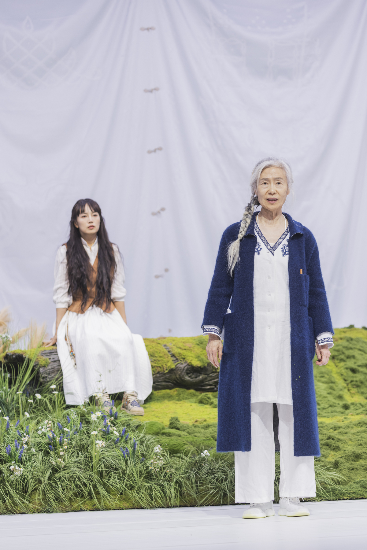 장면이 전환되면 외딴섬. 바닥을 덮은 짙은 이끼와 부드러운 풀밭 사이로 들꽃과 갈대가 피어있다. 이 고요한 은신처의 한 켠에 도톰한 가운을 입고 텀블러를 손에 쥔 백발의 여성이 앉아 있다. 지난 세월을 견디며 마음의 격랑을 내려놓은 그의 이름은 프로스페라. 폭풍으로 나폴리 왕과 동생 일행을 섬으로 끌어들여 무언가를 꾸미고 있는 이야기의 주인공이다.