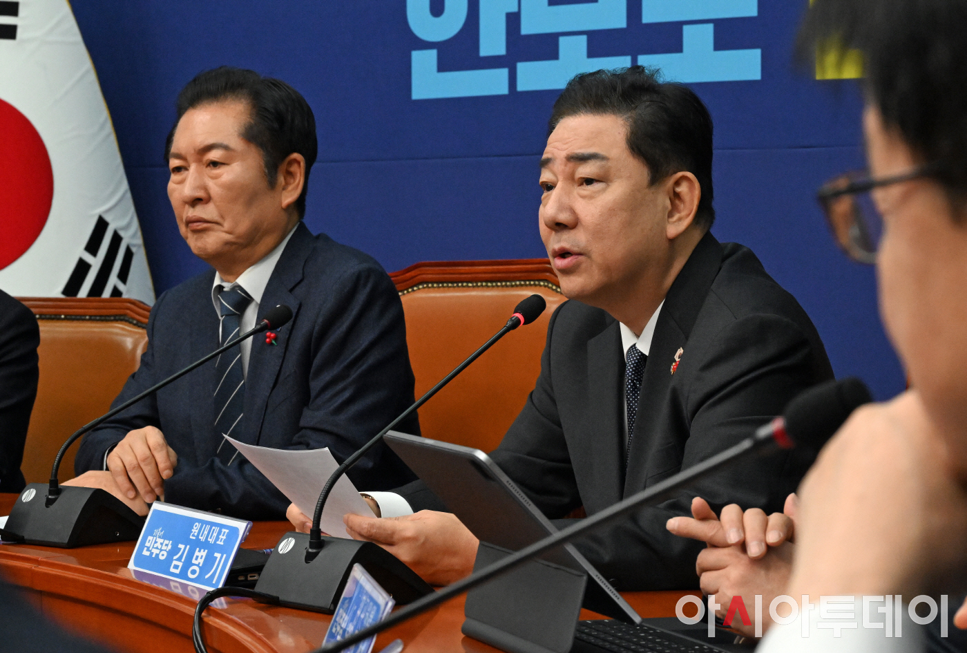 아시아투데이 송의주 기자 = 김병기 더불어민주당 원내대표가 15일 국회에서 열린 최고위원회의에서 발언을 하고 있다. 왼쪽은 정청래 대표.
