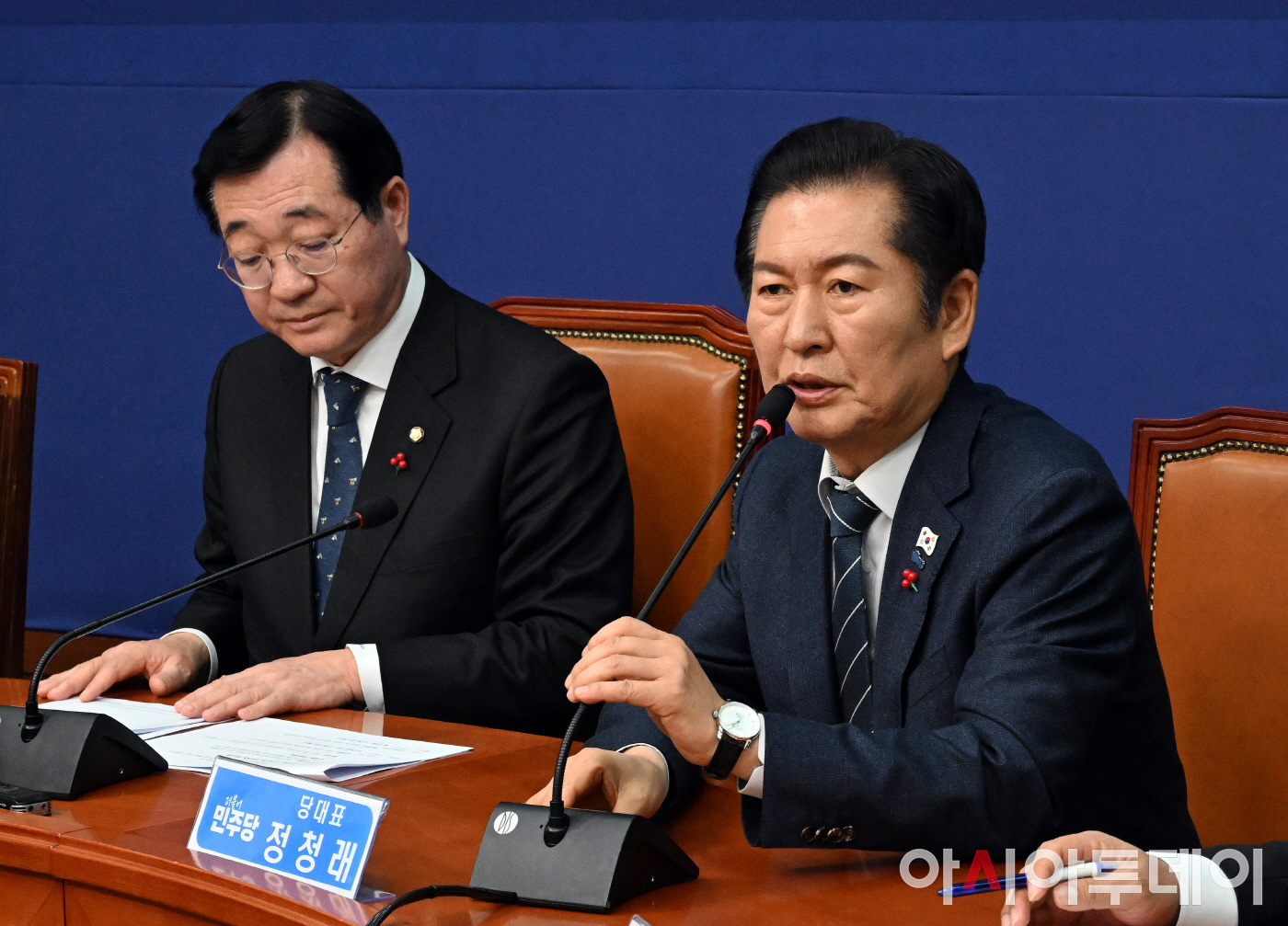 아시아투데이 송의주 기자 = 정청래 더불어민주당 대표가 15일 국회에서 열린 제4차 중앙위원회의에서 발언을 하고 있다.