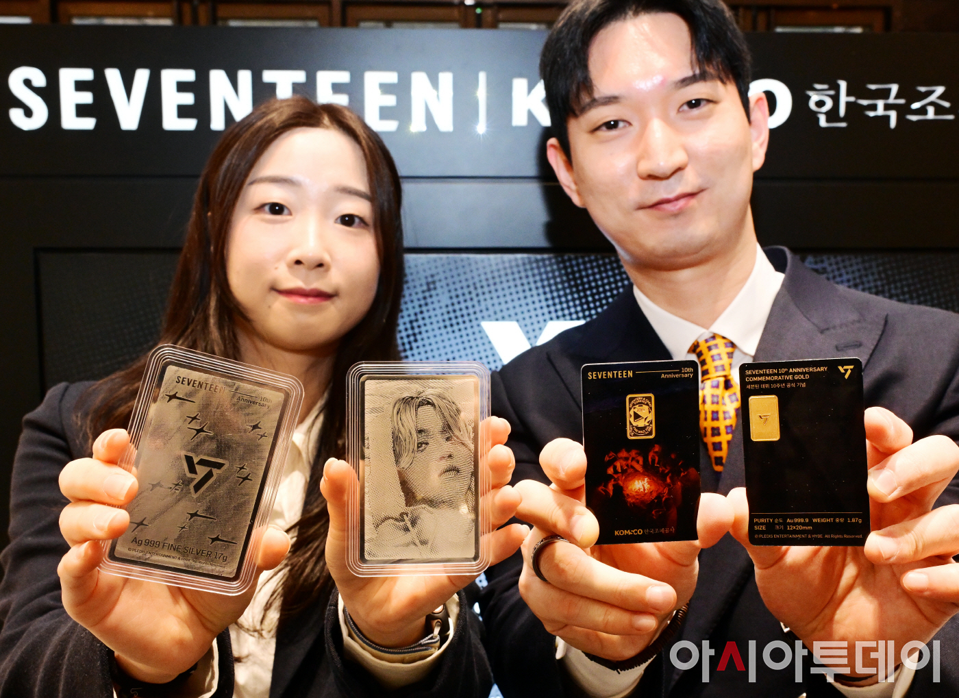 아시아투데이 박상선 기자 = 사는 15일 성남시 현대백화점 판교점에서 케이팝 그룹 세븐틴(SEVENTEEN) 데뷔 10주년을 기념한 두 번째 카드형 골드·실버를 공개했다.