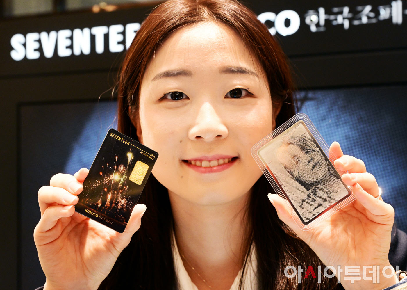 아시아투데이 박상선 기자 = 사는 15일 성남시 현대백화점 판교점에서 케이팝 그룹 세븐틴(SEVENTEEN) 데뷔 10주년을 기념한 두 번째 카드형 골드·실버를 공개했다.