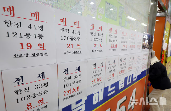 [서울=뉴시스] 서울 한 부동산 중개소에 내걸린 아파트 매매 안내문. photo@newsis.com |
