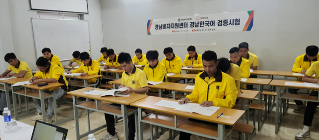 경남도 산업 현장 인력난 해소를 위한 광역형 비자로 입국한 외국인 기술 인력들이 한국어 능력 검증을 받고 있다. 경남도 제공 |