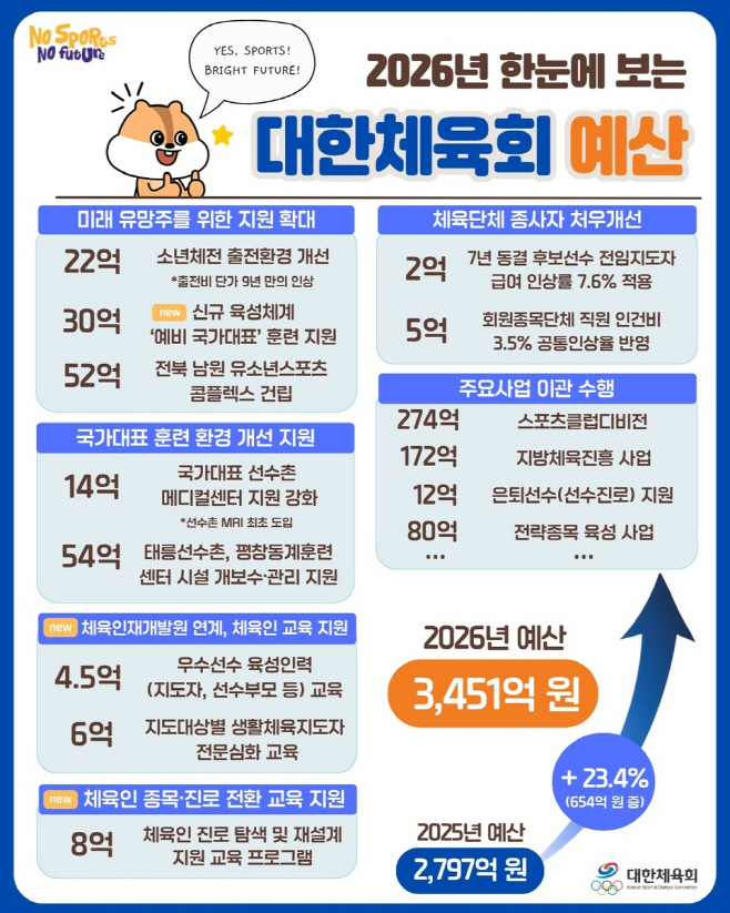 대한체육회는 15일 "2026년 예산이 올해(2797억원)보다 654억원(23.4%) 증가했다"며 "문화체육관광부 및 유관기관에서 630억원 규모의 사업이 대한체육회로 이관되고, 체육인 지원을 위한 필요 예산이 반영되면서 전체 예산 규모가 확대됐다"고 설명했다.