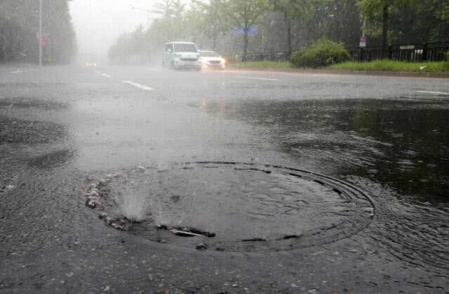수도권에 집중호우가 쏟아진 8월 13일 경기 고양시의 도로 위 맨홀뚜껑이 들썩이고 있다. (사진=연합뉴스) |