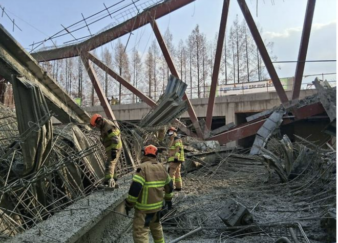 광주광역시 서구 치평동 광주대표도서관 붕괴 현장에서 구조대원들이 현장을 둘러 보고 있다. (광주소방본부 제공) |