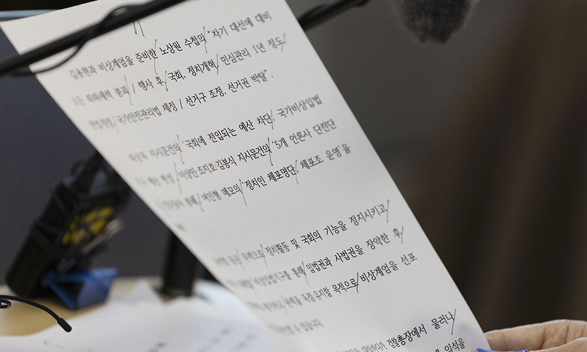 ‘정치인 체포명단’ 선명한 특검 발표문 15일 조은석 특별검사가 들고 있는 발표문에 ‘선거구 조정’, ‘정치인 체포명단’ 등의 문구가 적혀 있다. 12·3 비상계엄 관련 의혹을 수사해 온 내란 특별검사팀은 윤석열 전 대통령의 계엄 선포 목적을 ‘권력 독점과 유지’로 규정했다. 최상수 기자 |