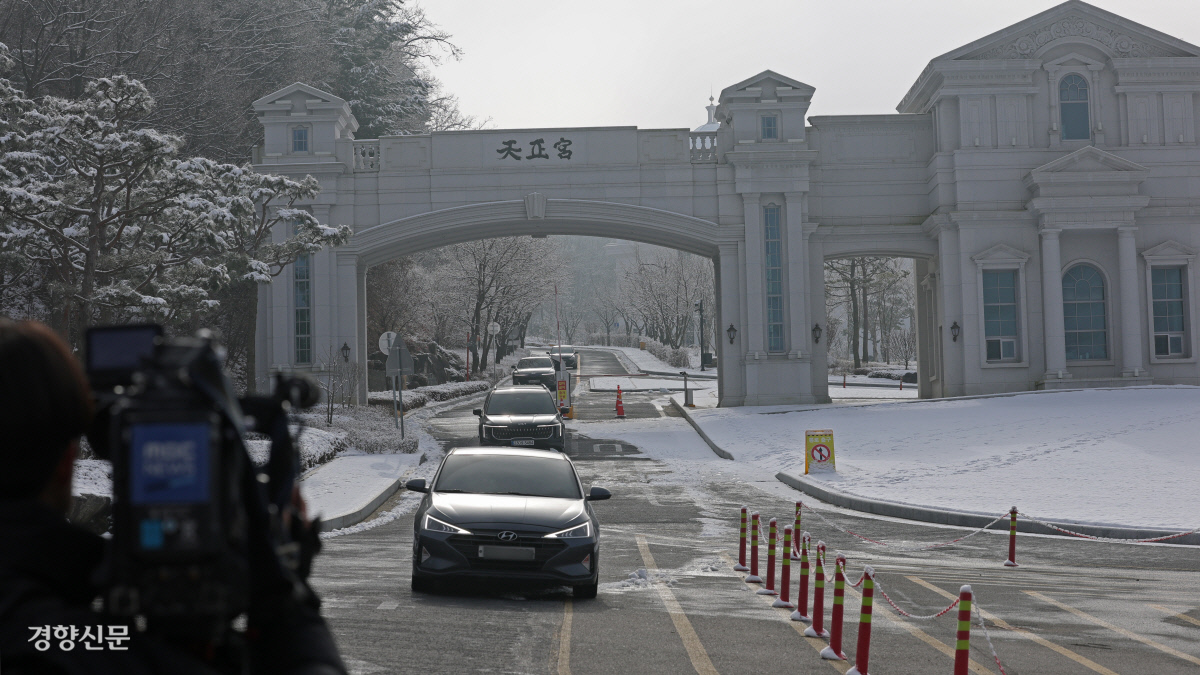 고요 깨진 천정궁 경찰이 정치권 인사들의 통일교 금품수수 의혹과 관련해 전방위 압수수색에 나선 15일 ‘통일교 성지’인 경기 가평군 천정궁에서 차량들이 이동하고 있다. 정효진 기자 |