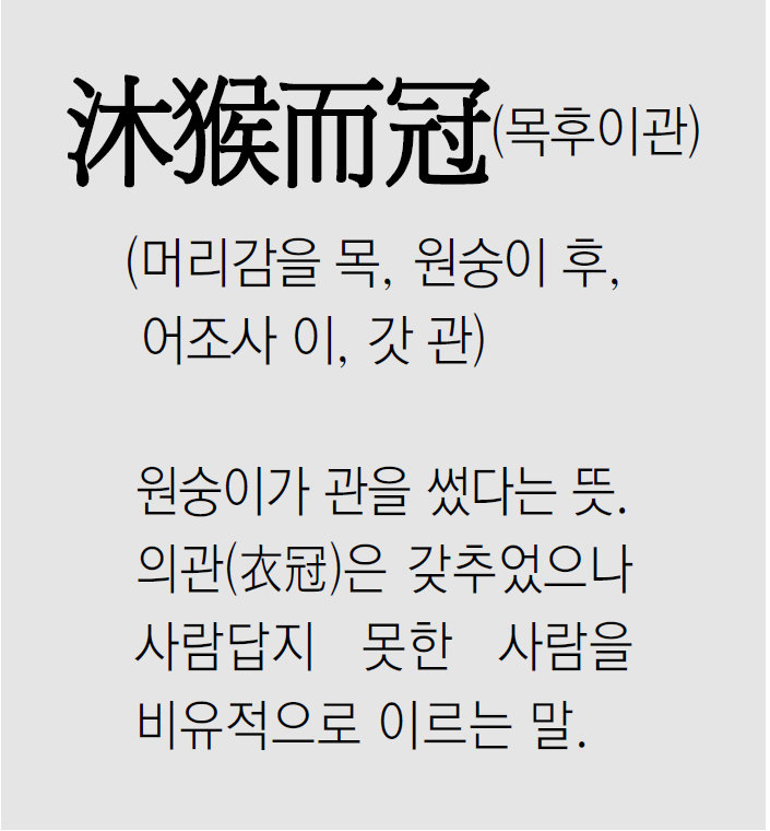 ● 유래: 사기(史記)의 항우본기(項羽本紀)에서 유래한 성어입니다. 기원전 206년 진(秦)나라를 멸망시킨 초(楚)나라의 장수 항우(項羽)는 진나라의 수도인 함양(咸陽)에 입성했습니다. 항우는 진나라의 궁궐을 불태운 뒤, 자신의 근거지인 팽성(彭城)으로 돌아가려 했습니다. 이때 한생(韓生)이라는 사람이 항우에게 진언하기를, 함양은 사방의 요충지이며 패왕(覇王)이 천하를 호령할 만한 기반이니 이곳에 도읍을 정해야 한다고 간언했습니다. 하지만 항우는 고향으로 돌아가 부귀영화를 뽐내고 싶은 마음에 사로잡혀 있었습니다. 그는 “부귀하게 되어 고향으로 돌아가지 않는 것은 비단옷을 입고 밤중에 돌아다니는 것과 같다”라며 함양에 머무는 것을 거부했습니다. 이에 한생은 크게 실망하며 “사람들이 초나라 사람을 ‘원숭이가 갓을 쓴 것(沐猴而冠)에 불과하다’고 말하더니, 과연 그렇구나!”라고 비웃었습니다. 이 말에 격노한 항우는 그 자리에서 한생을 죽였습니다. 한생이 항우를 ‘목후이관’이라고 비판한 이유는 항우가 천하를 통일할 기세는 가졌으나 천하의 도읍인 함양을 버리고 변방인 고향으로 돌아가 부귀를 자랑하려는 좁은 생각에만 갇혀 있었기 때문입니다. 군주로서의 원대한 비전이나 장기적인 안목 없이, 겉치레와 일시적인 만족만을 추구하는 천박함을 조롱한 것입니다.