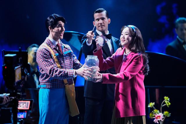 한국 창작 뮤지컬 '어쩌면 해피엔딩'의 브로드웨이 버전 '메이비 해피엔딩'의 남녀 주인공 대런 크리스(왼쪽)와 헬렌 셴이 6월 8일 미국 뉴욕 라디오시티 뮤직홀에서 열린 제78회 토니상 시상식에서 공연의 일부를 시연하고 있다. 뉴욕=AP 연합뉴스 |