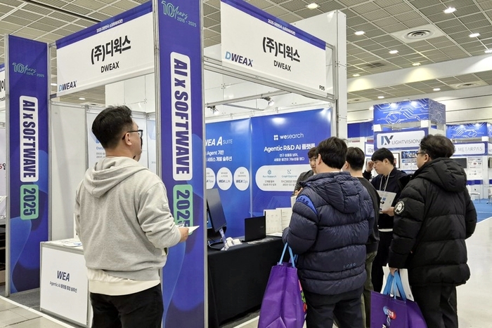 디윅스가 ‘2025 소프트웨이브’에서 자사의 생성형 AI 기반 연구 플랫폼 ‘위서치(wesearch)’ 를 공개했다. 디웍스 부스에 찾아온 방문객들이 부스를 둘러보고 있다. [디웍스] |