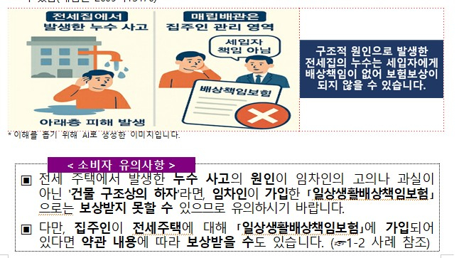 실제 금감원 분쟁조정에서는 전세 주택에서 발생한 누수 사고의 원인이 임차인의 고의나 과실이 아닌 '건물 구조상의 하자'라면, 임차인이 가입한 일상생활배상책임보험으로는 보상받지 못할 수 있다고 안내한다. 다만 집주인이 전세주택에 대해 일상생활배상책임보험에 가입돼 있다면 약관 내용에 따라 보상받을 수도 있다.