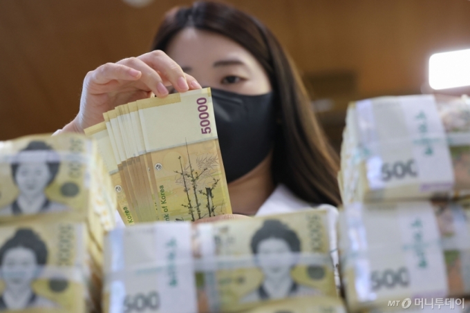 15일 서울 중구 하나은행 위변조대응센터에서 직원이 원화를 정리하고 있다. /사진=뉴시스 |