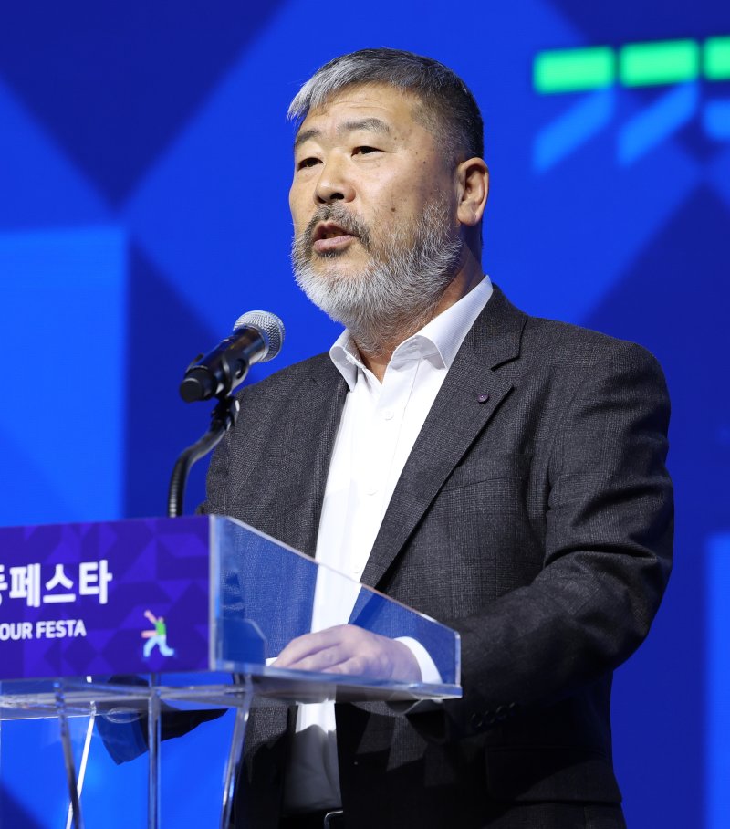 김동명 한국노총 위원장이 16일 오전 경기 고양시 킨텍스(KINTEX)에서 열린 2025 국제노동페스타 개막식에서 축사를 하고 있다. 경기도와 국제노동기구(ILO), 고용노동부가 '청년, 지방정부 그리고 일의 미래'를 주제로 마련한 이번 행사는 오는 16~17일 양일간 킨텍스 제2전시관에서 진행된다. 뉴스1 |
