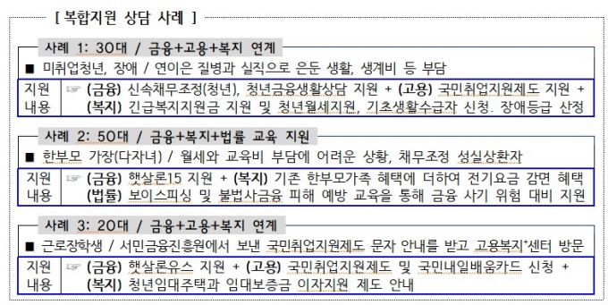 금융위와 보건복지부, 고용노동부, 중소벤처기업부 등은 내년 복합지원 업무계획을 마련했다. 우선 복합지원 연계 분야가 확대된다. 고용·복지 지원에 대한 강화와 함께 공공의료, 노후, 소상공인 분야 등을 추가한다. 공공의료 분야에서는 국립중앙의료원·국립암센터와 협업해 의료비 등의 지원이 필요한 경우 적시에 지원(예시: 불법사금융예방대출, 100만원 한도)한다.