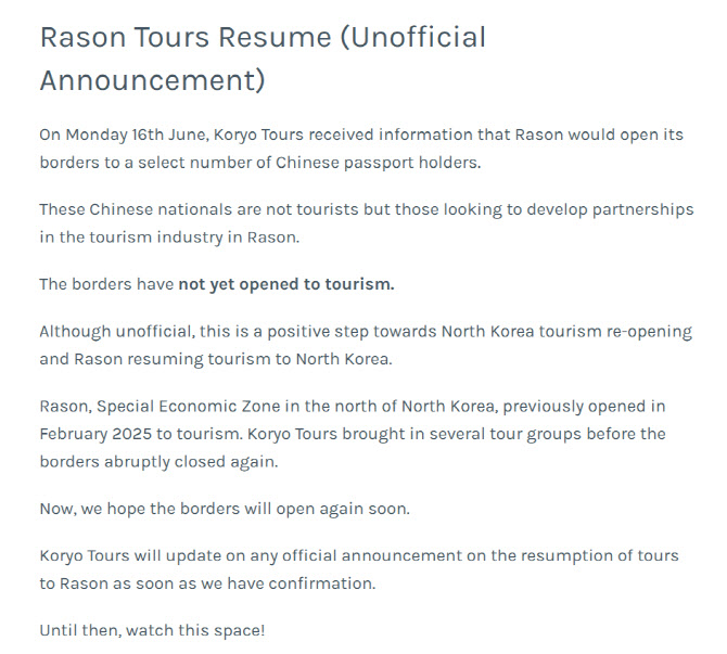 중국 소재 북한 전문 여행사 ‘고려투어스’는 16일 홈페이지에 ‘나선 투어 재개-비공식 발표’라는 제목의 공지를 게재했다. 여행사는 “지난 6월 16일 나선이 일부 중국 여권 소지자에게 국경을 개방할 것이라는 정보를 입수했다”고 밝혔다. 대상은 일반 관광객이 아닌 나선 관광산업 파트너십 구축을 희망하는 중국 사업가다. 고려투어스는 “비공식이긴 하지만 북한 관광 재개와 나선 관광 재개를 향한 긍정적 움직임”이라며 “곧 국경이 다시 열리길 기대한다”고 전했다.