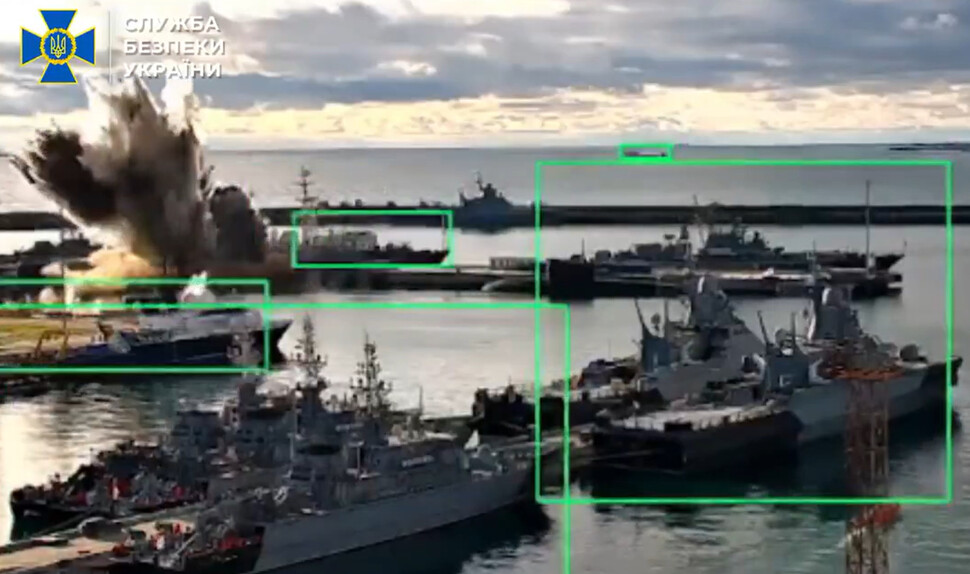 우크라이나의 정보기관인 우크라이나 보안국(SBU)이 소셜미디어 등을 통해 공개한 타격 영상 갈무리. |