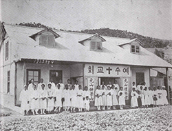 ‘원산 예수교회’. 1933년 9월 9일 새벽 3시, 이용도 목사의 주례로 백남주 목사의 임직식과 성찬식이 거행되었다. 같은 날 오전 9시에는 약 30명이 참석한 가운데 원산예배당 개천식이 거행되었다. 사진 출처=이용도 목사 사진첩 및 숭모문집(1986). |