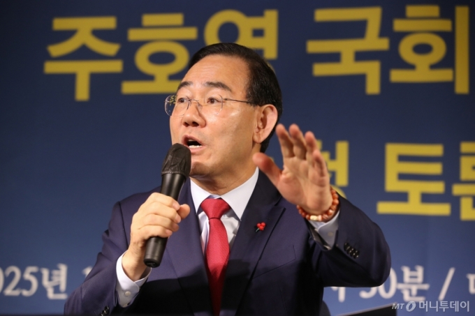[대구=뉴시스] 정창오 기자=주호영 국회부의장(국민의힘, 대구 수성구갑)이 8일 오전 대구 남구 이천동 대구아트파크에서 열린 아시아포럼21 정책토론회에 참석해 발언하고 있다(사진=아시아포럼21 제공) 2025.12.08 jco@newsis.com *재판매 및 DB 금지 /사진=정창오 |