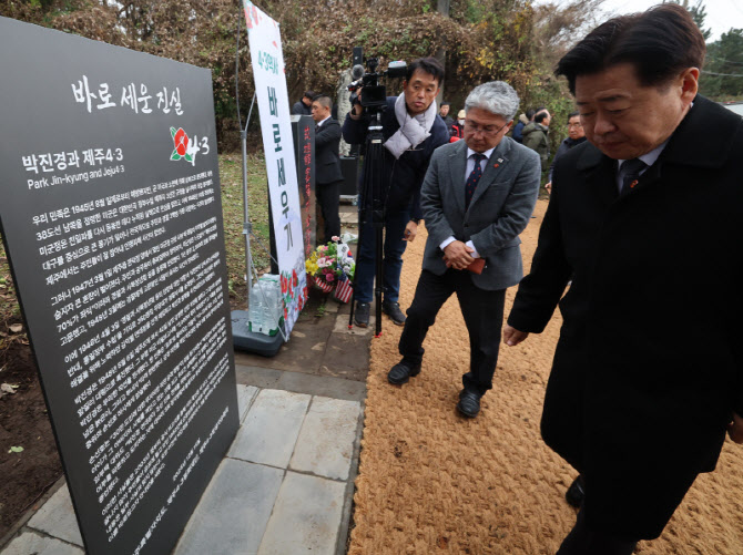 전날 제주도와 제주4·3평화재단, 제주4·3희생자유족회는 제주시 산록도로 한울공원 인근 도로변에 있는 박진경 대령 추도비 옆에 제주4·3사건의 진실을 담은 ‘바로 세운 진실’ 안내판을 설치했다.