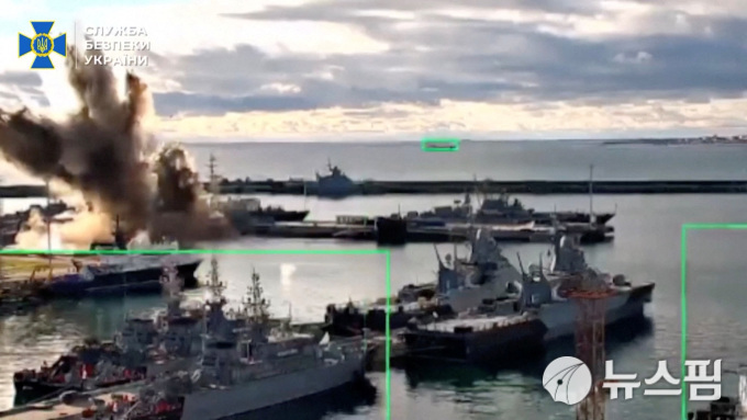SBU가 이날 공개한 영상에는 러시아 군항에 군함 여러 척이 정박해 있는 가운데 바다 아래에서 큰 폭발이 일어나 물보라가 치솟는 장면이 담겼다.